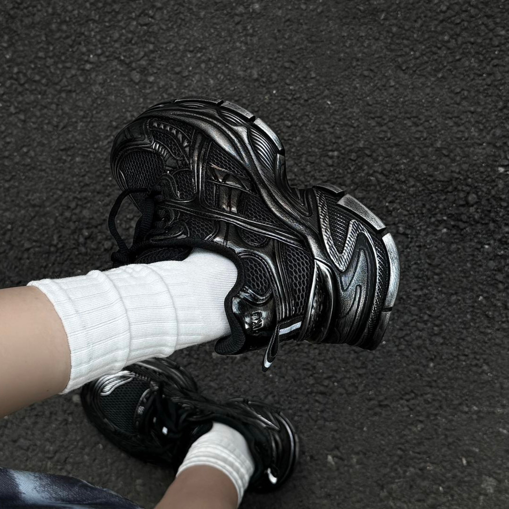 深みのあるブラックのベースに、手作業によるシルバー加工を一点一点施し、1足ごとに異なる風合いを実現。