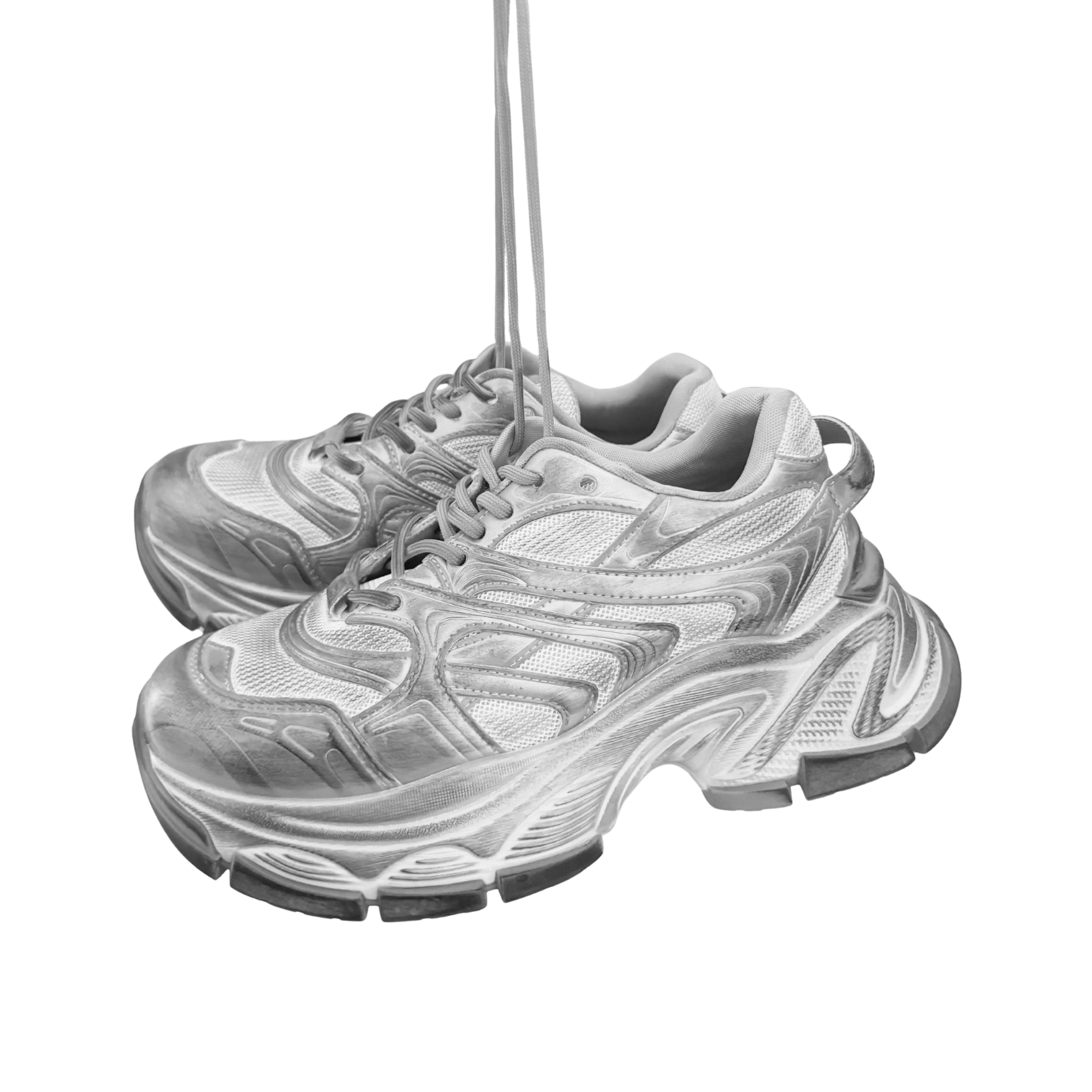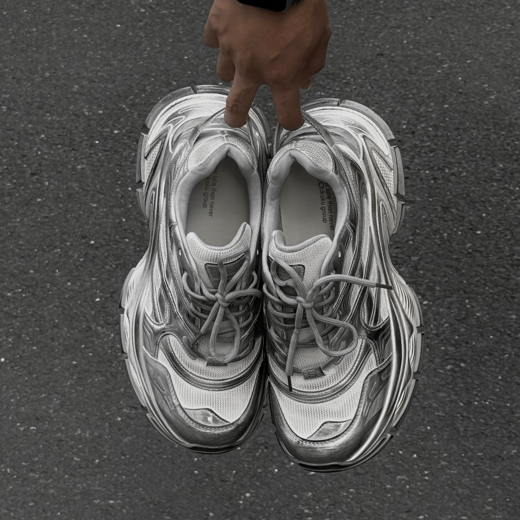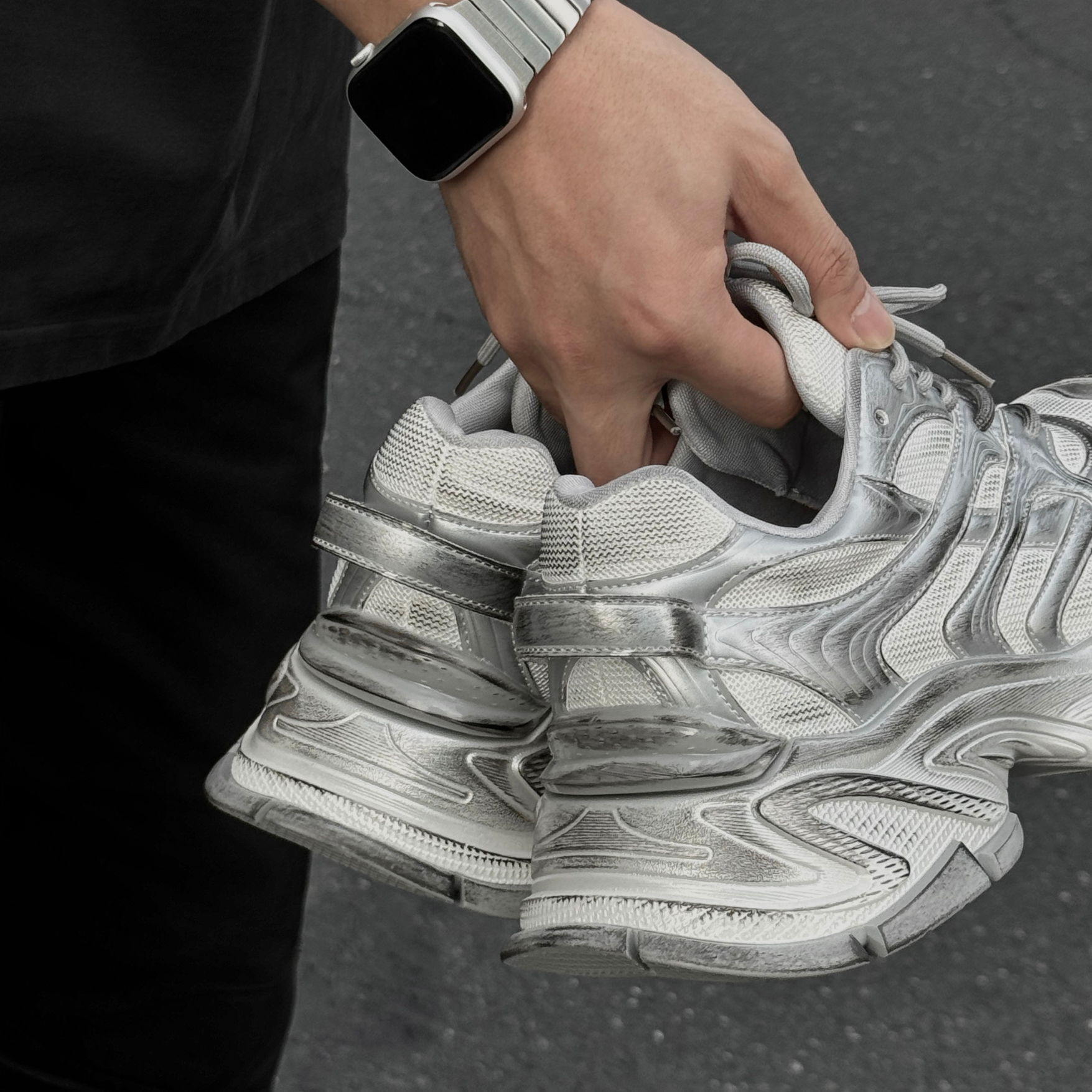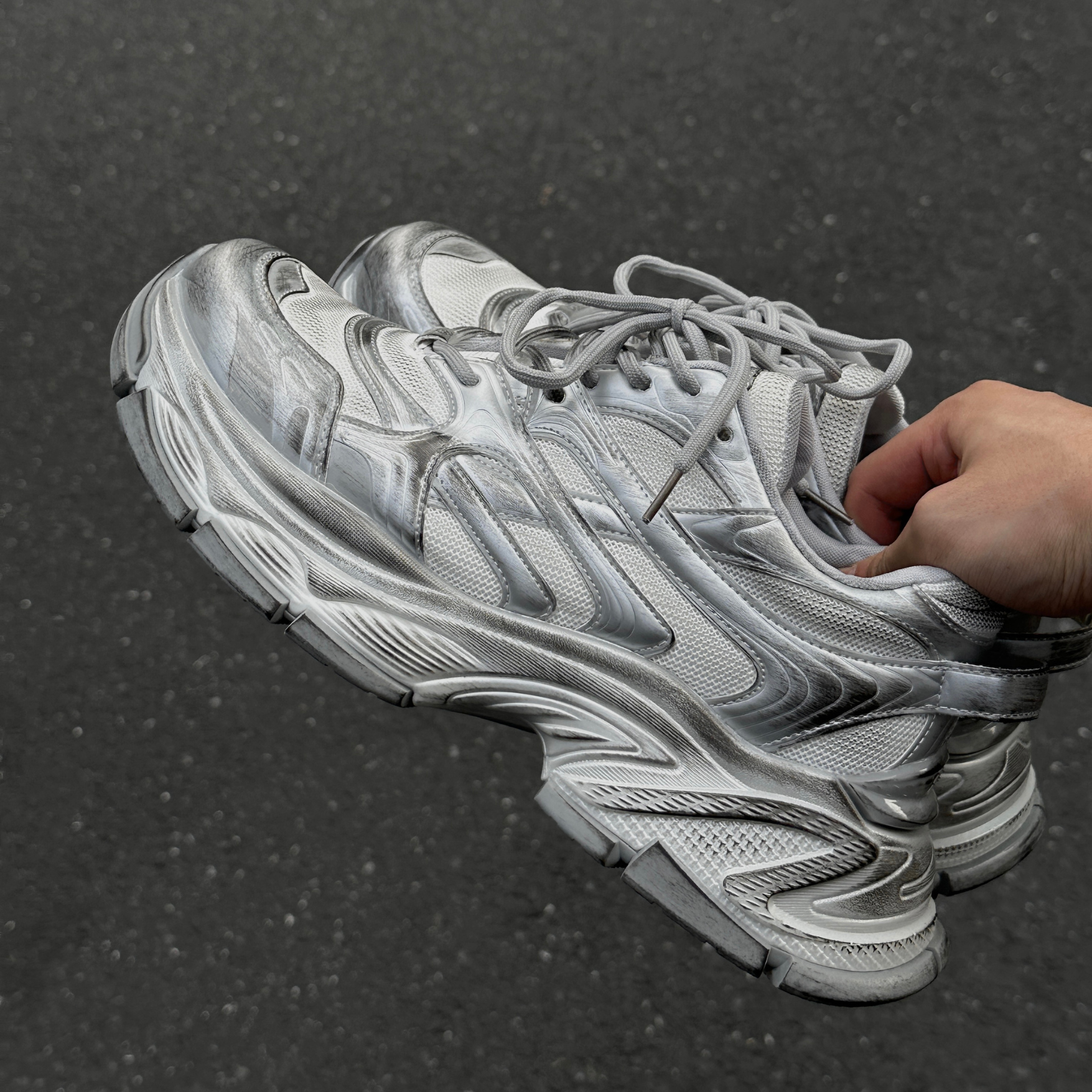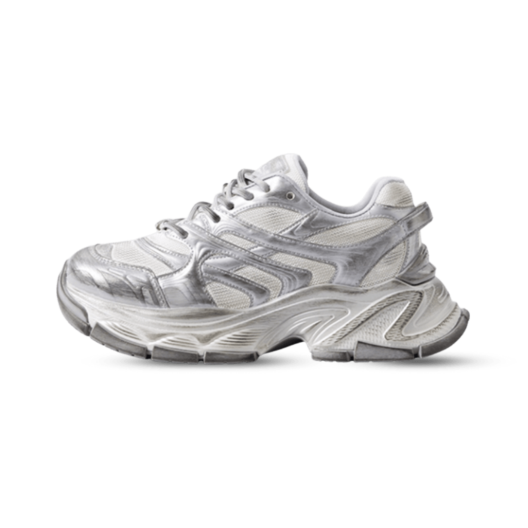くすみがかったホワイトをベースに、手作業によるシルバー加工を一点一点施し、1足ごとに異なる独自の風合いを実現。